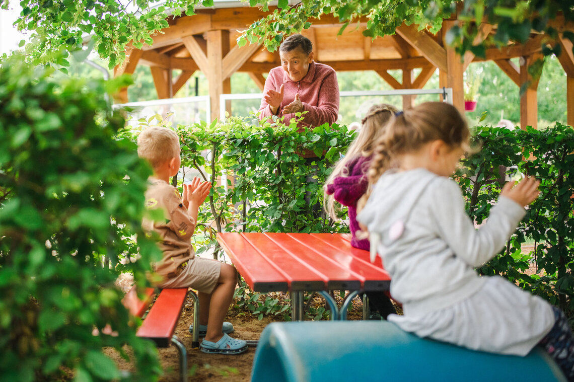 Die pädagogischen Fachkräfte gehen einfühlsam und individuell auf die verschiedenen Bedürfnisse und Entwicklungsstände der betreuten Kinder ein. Der Fokus liegt auf dem Gesundheitskonzept nach Sebastian Kneipp, teiloffenen Strukturen und der Erziehung zu Selbstständigkeit und Gemeinschaftsfähigkeit. In unserem Haus wird Teilhabe gelebt, miteinander neue und alte Lieder gesungen und viel gelacht. Das großzügige Außengelände lädt zum Entdecken und Forschen ein, Erfahrungen in der Natur werden gesammelt und dabei das eigene Können erprobt. Selbst angebautes Obst, Gemüse und Heilkräuter werden mit den Kindern verarbeitet und auf der einladenden Terrasse gemeinsam vernascht.