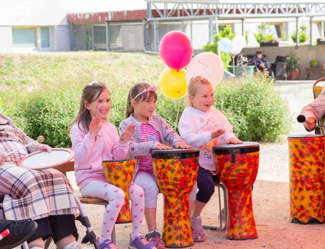 In der GVS-Kita „Oesig“ begann beispielsweise der Tag zusammen mit den Senior*innen im Morgenkreis. Ein ganz besonderes, musikalisches Highlight ermöglichte Peter Grunwald von der Musikakademie, Kloster Michaelstein. Mit allerlei Instrumenten im Gepäck sorgte er für ausgelassene Stimmung und einen musikalischen Start in den Tag. Der gemeinsame Trommelwirbel begeisterte Jung & Alt gleichermaßen.
