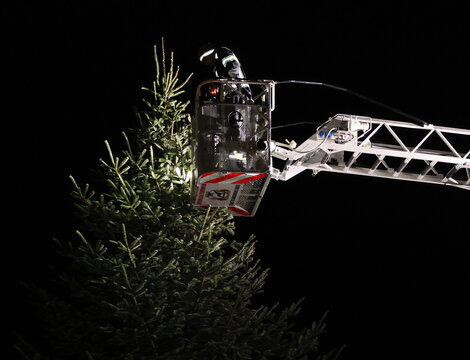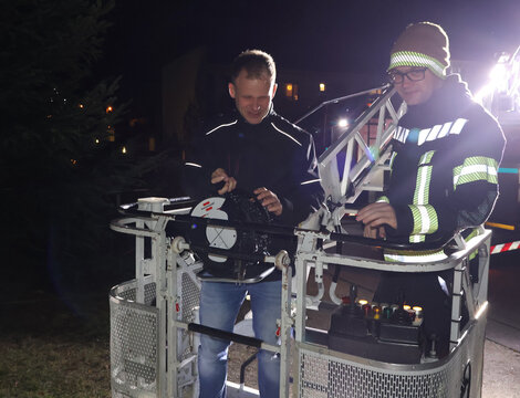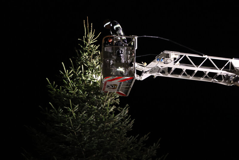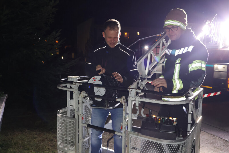 Ein besonderes Highlight des Abends war der Besuch der Freiwilligen Feuerwehr Blankenburg. Mit ihrer Drehleiter unterstützten die Kameradinnen und Kameraden das Schmücken unseres etwa acht Meter hohen Weihnachtsbaumes und sorgten dafür, dass die Lichter eindrucksvoll erstrahlen konnten. Dieser Moment begeisterte Jung und Alt gleichermaßen.